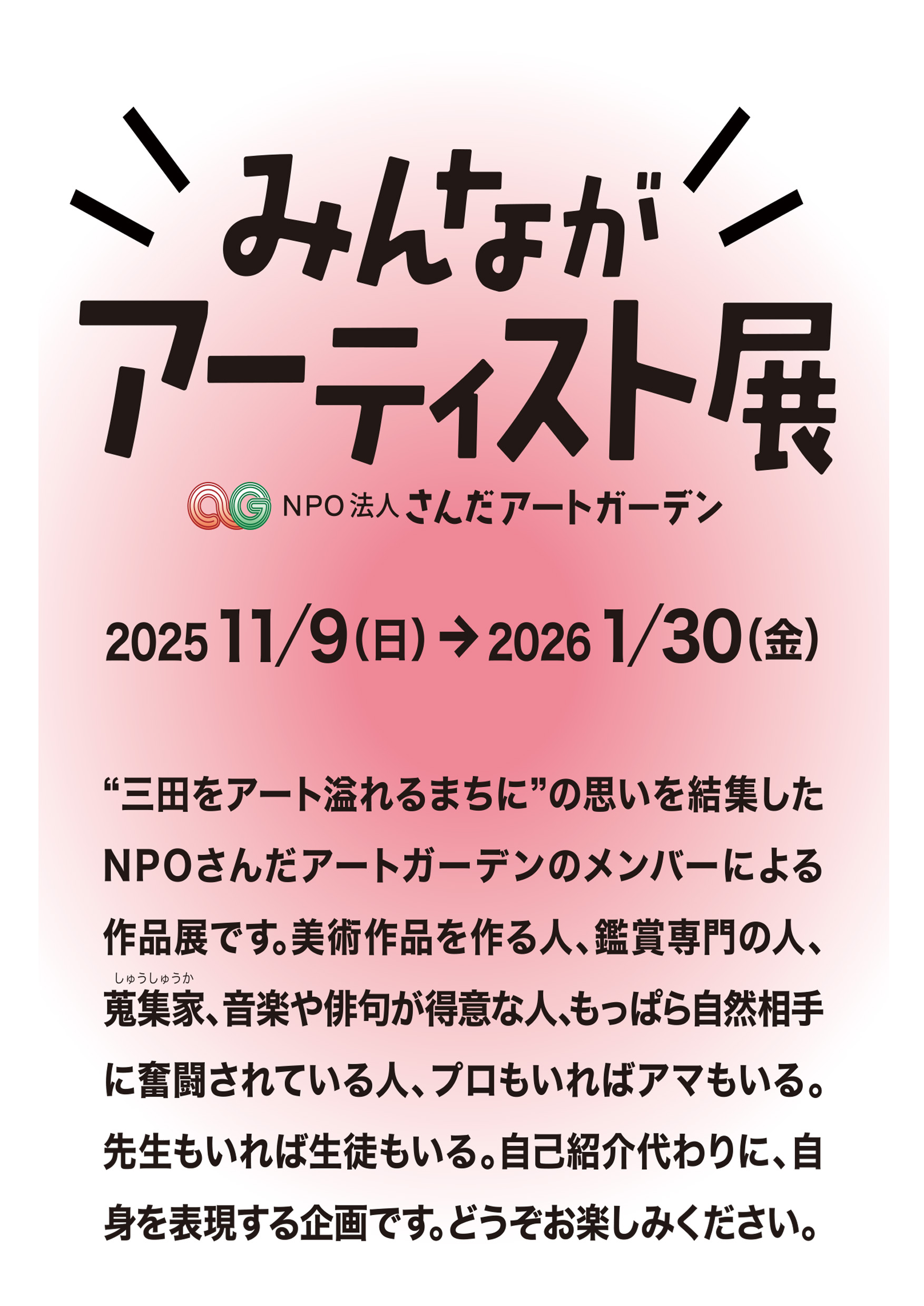 アートガーデンに託した大石画伯の思いは、芸術・自由・解放・平和・平等といった言葉で表されます。それは、この時代に生きる全ての大人や子供達に、命の大切さ、生きる喜びを呼び起こすものです。2025年年末から26年初春にかけ、アートガーデン(兵庫県三田市中内神)ギャラリーでは、「NPO法人さんだアートガーデン」会員有志の作品展示を行います。毎週土曜日は確実にオープンしています。恐縮ですが、その他の曜日は不定期ですので、お問合せください。